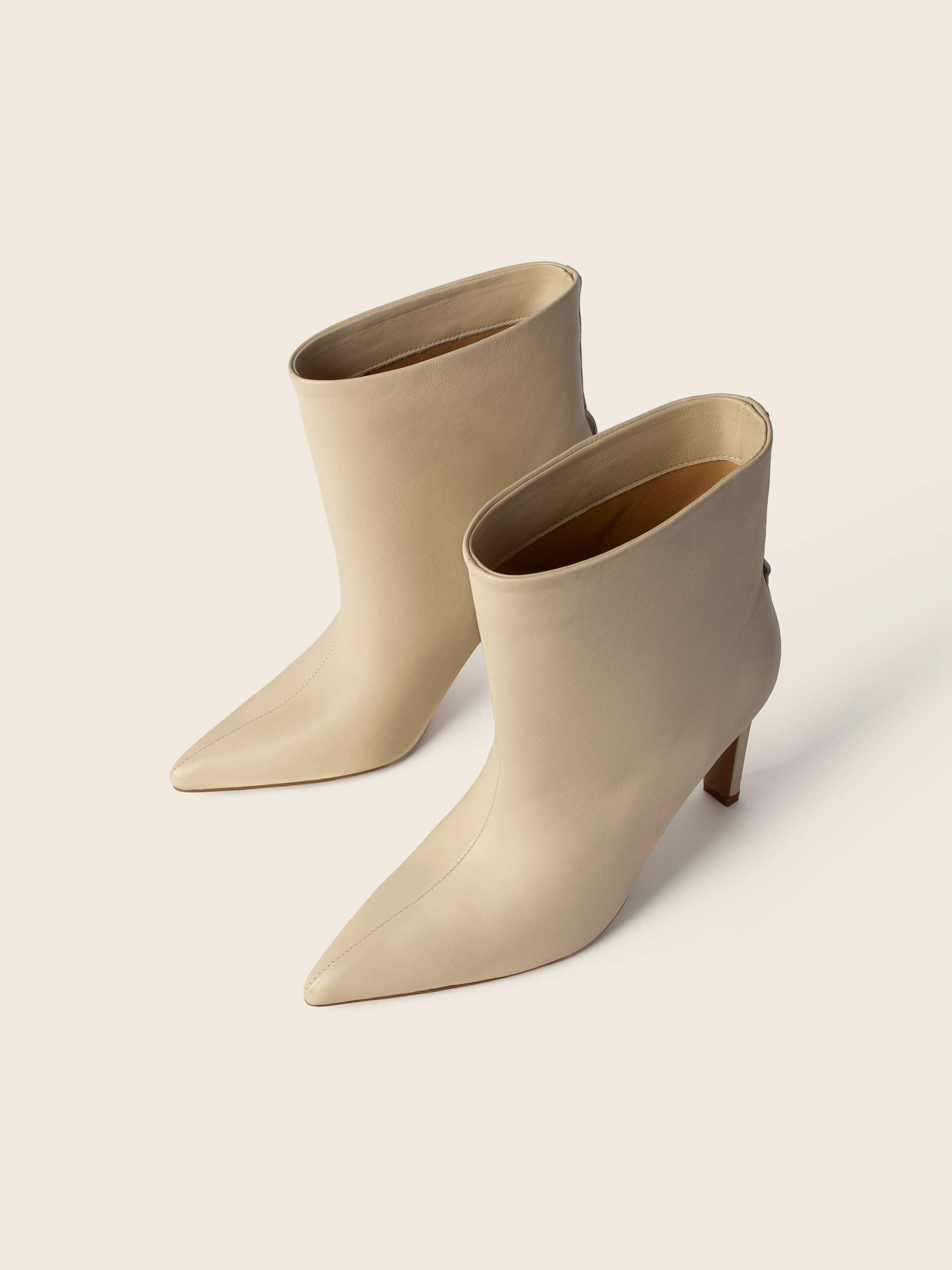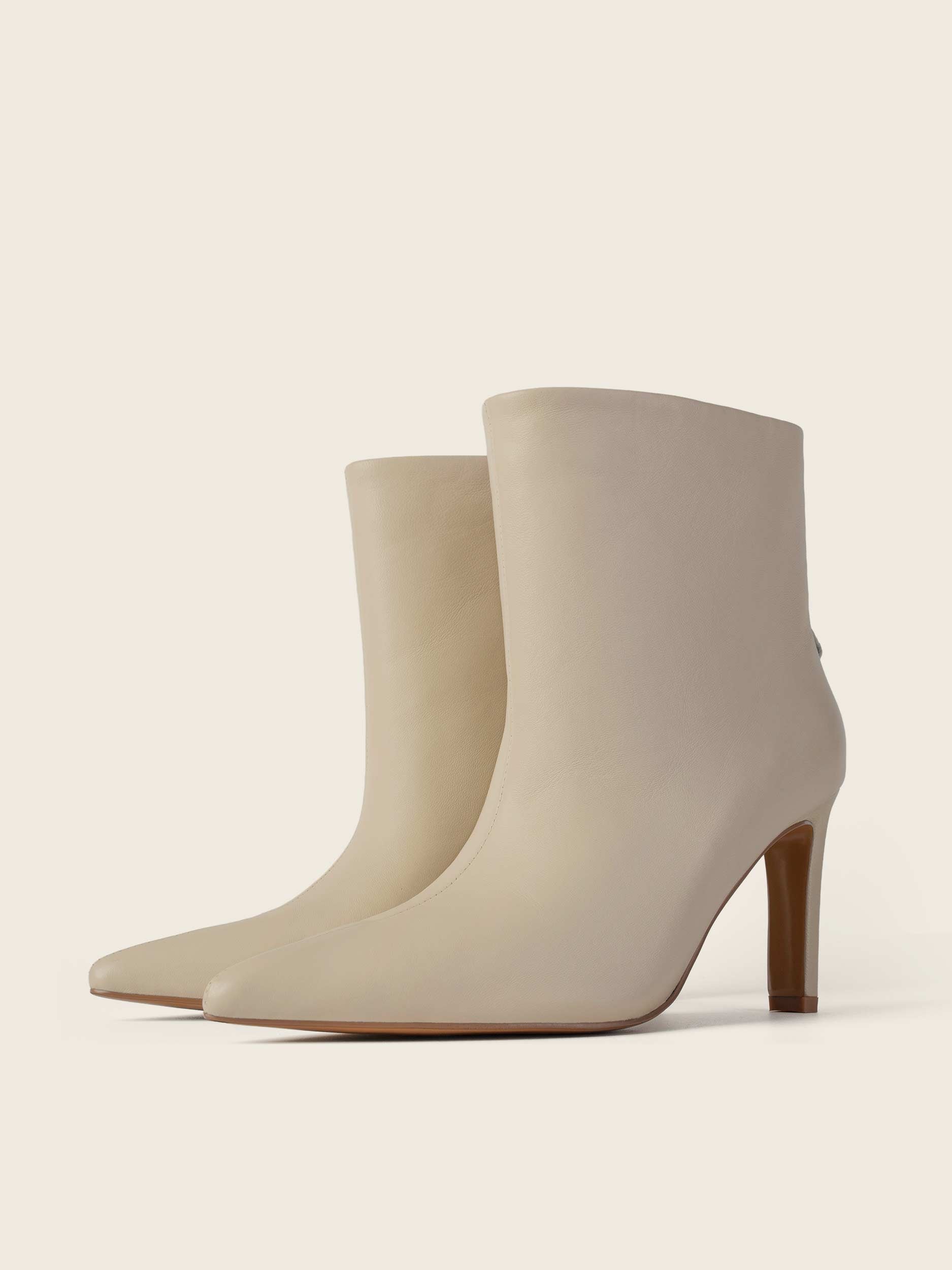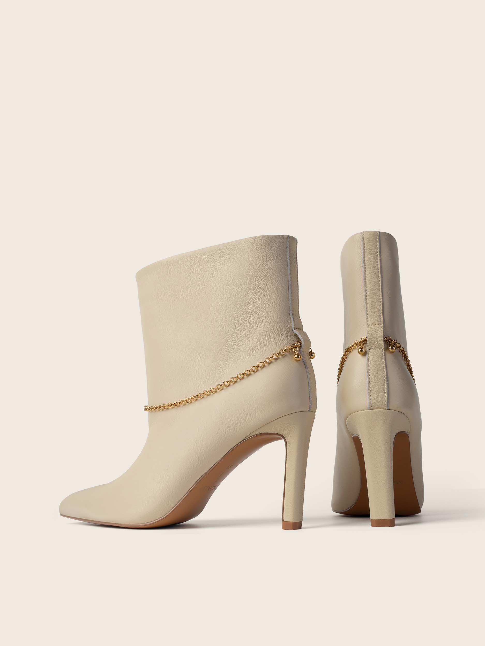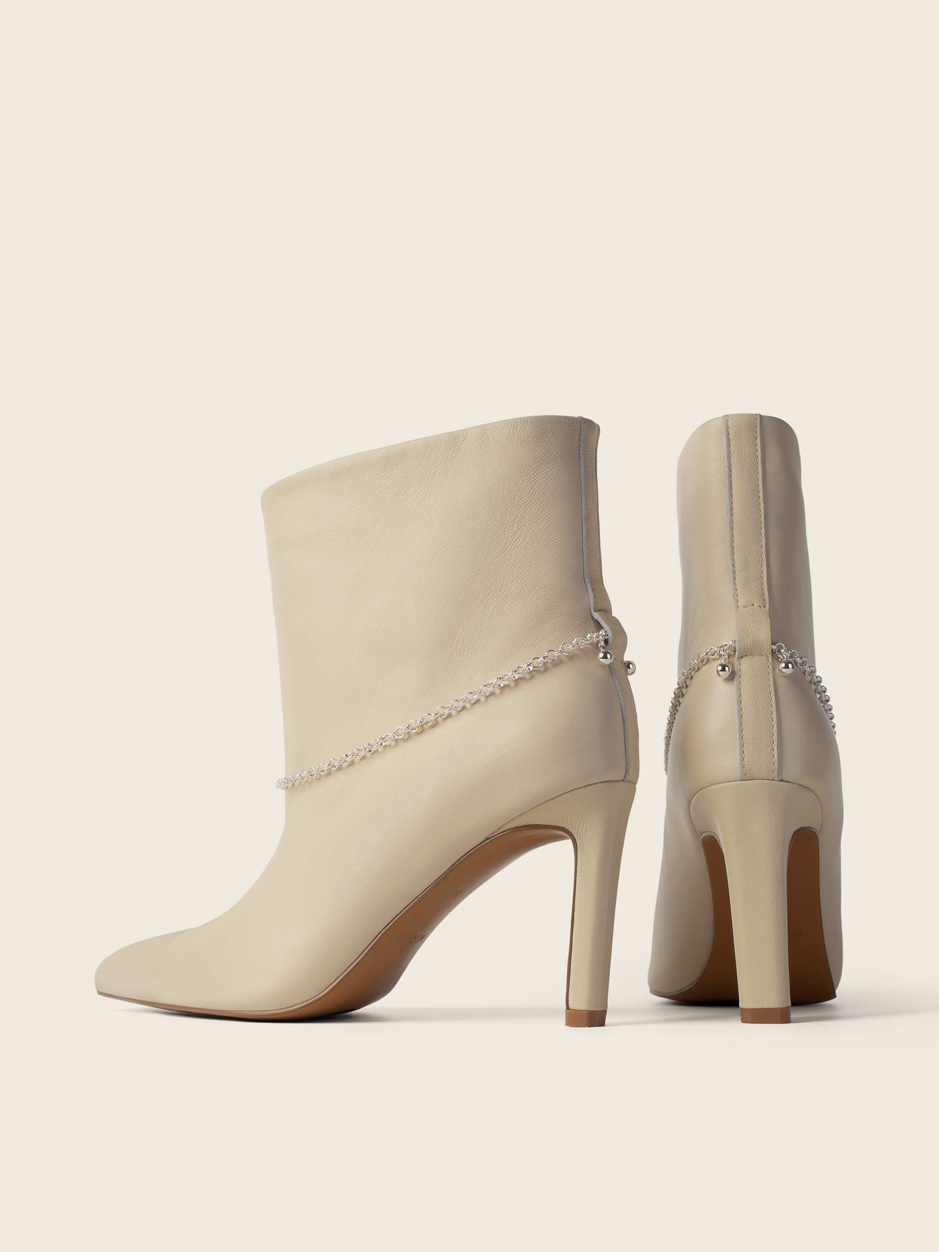 Wsuwane botki na wysokim obcasie (8 cm) w kolorze czarnym, beżowym, czarne plecione z naturalnej skóry licowej. Obuwie o szerokiej cholewce dostarczane z łańcuszkami złotym i srebrnym. Wsuwane botki na wysokim obcasie (8 cm).