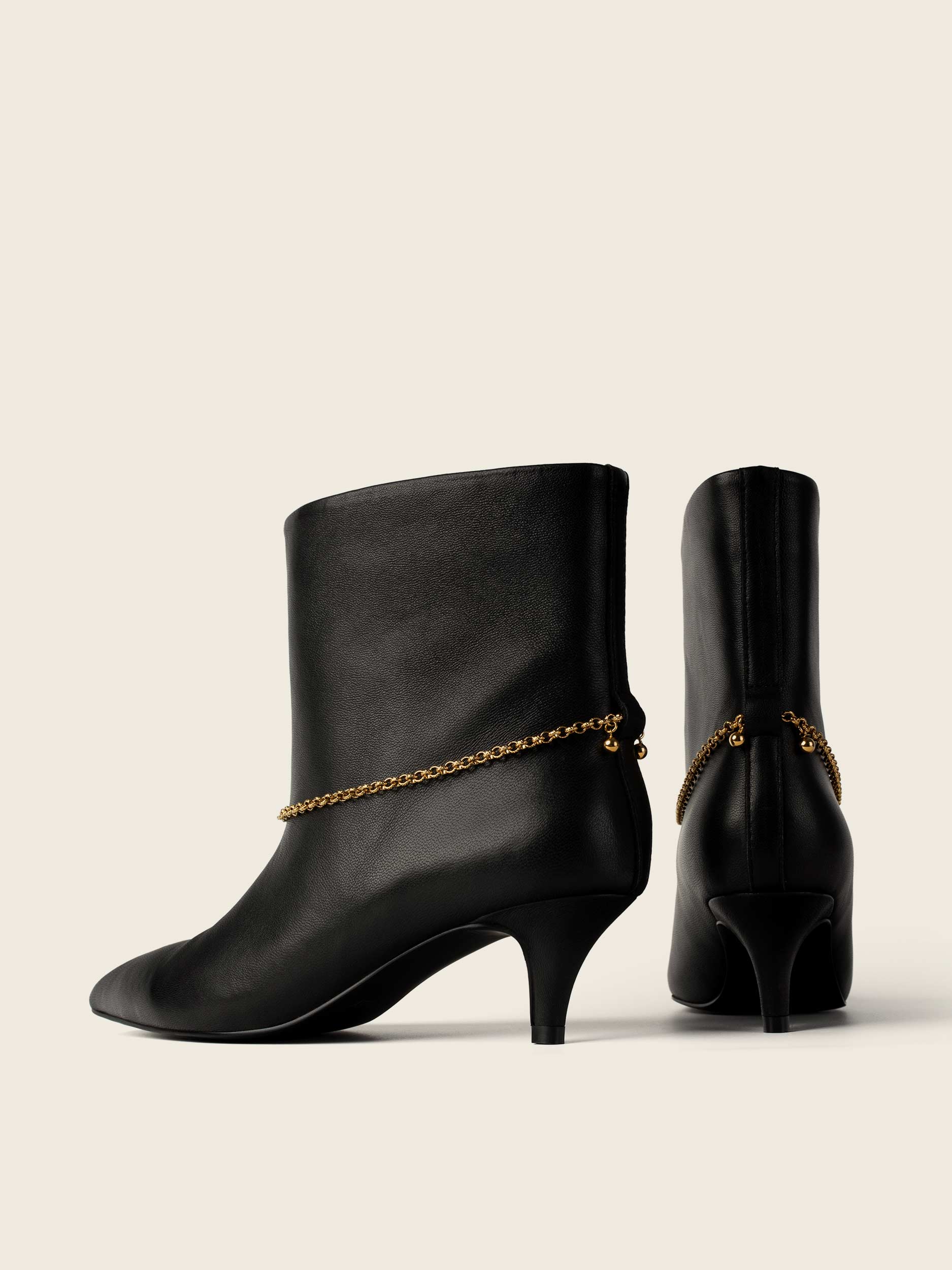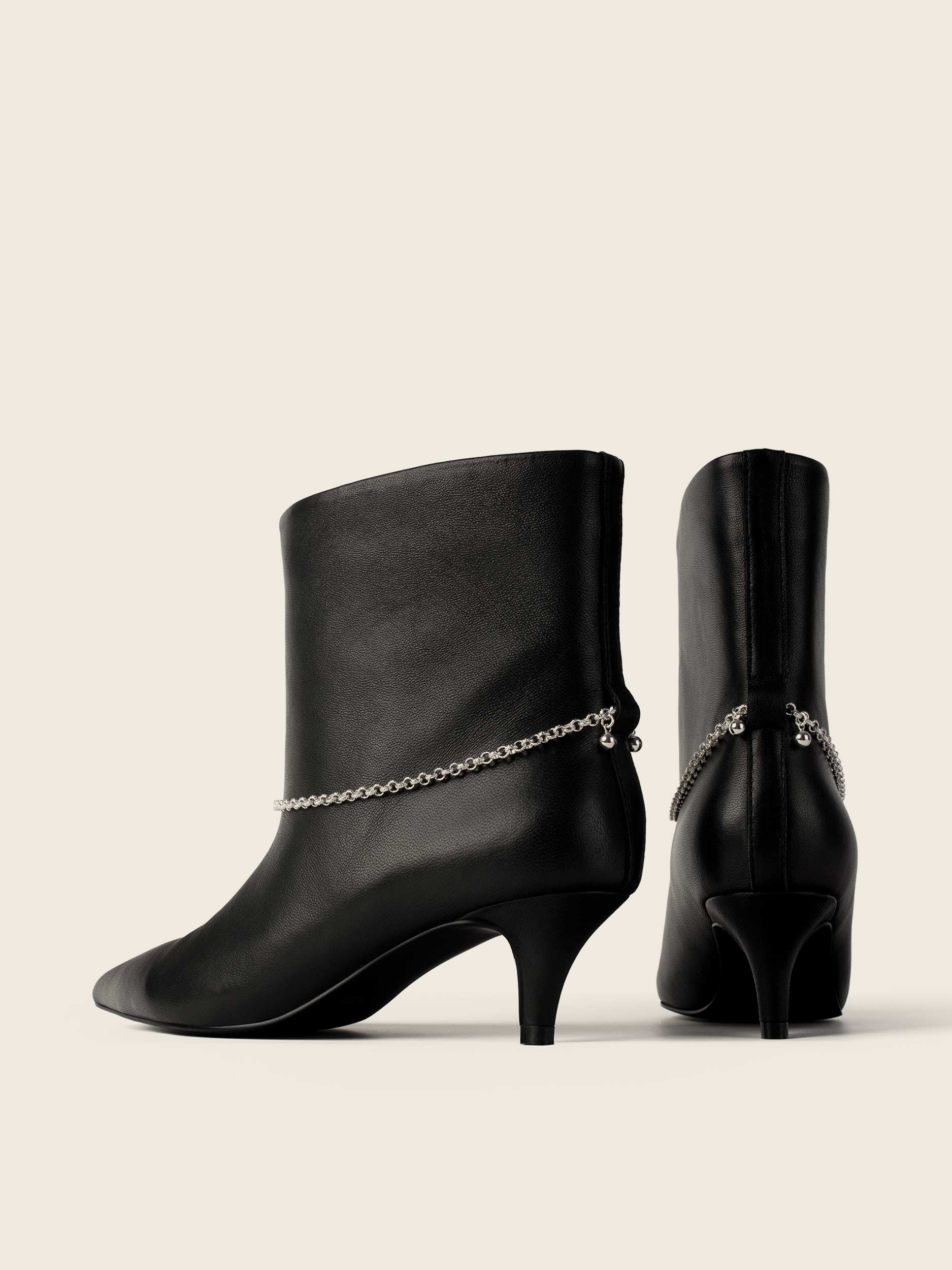 Wsuwane botki w kolorze czarnym z owczej naturalnej skóry licowej. Obuwie o szerokiej cholewce dostarczane z łańcuszkami. Obcas typu kaczuszka.