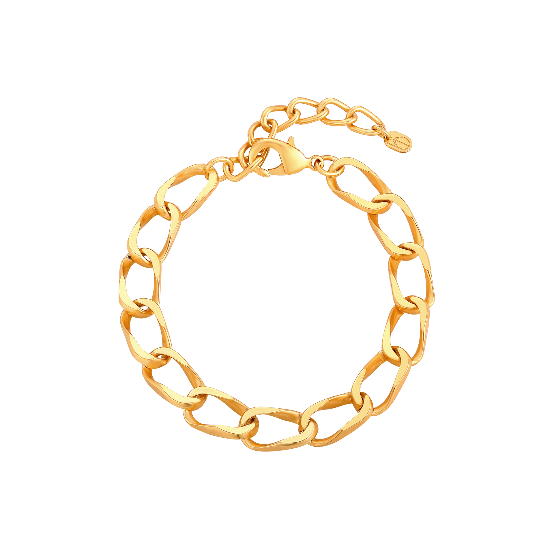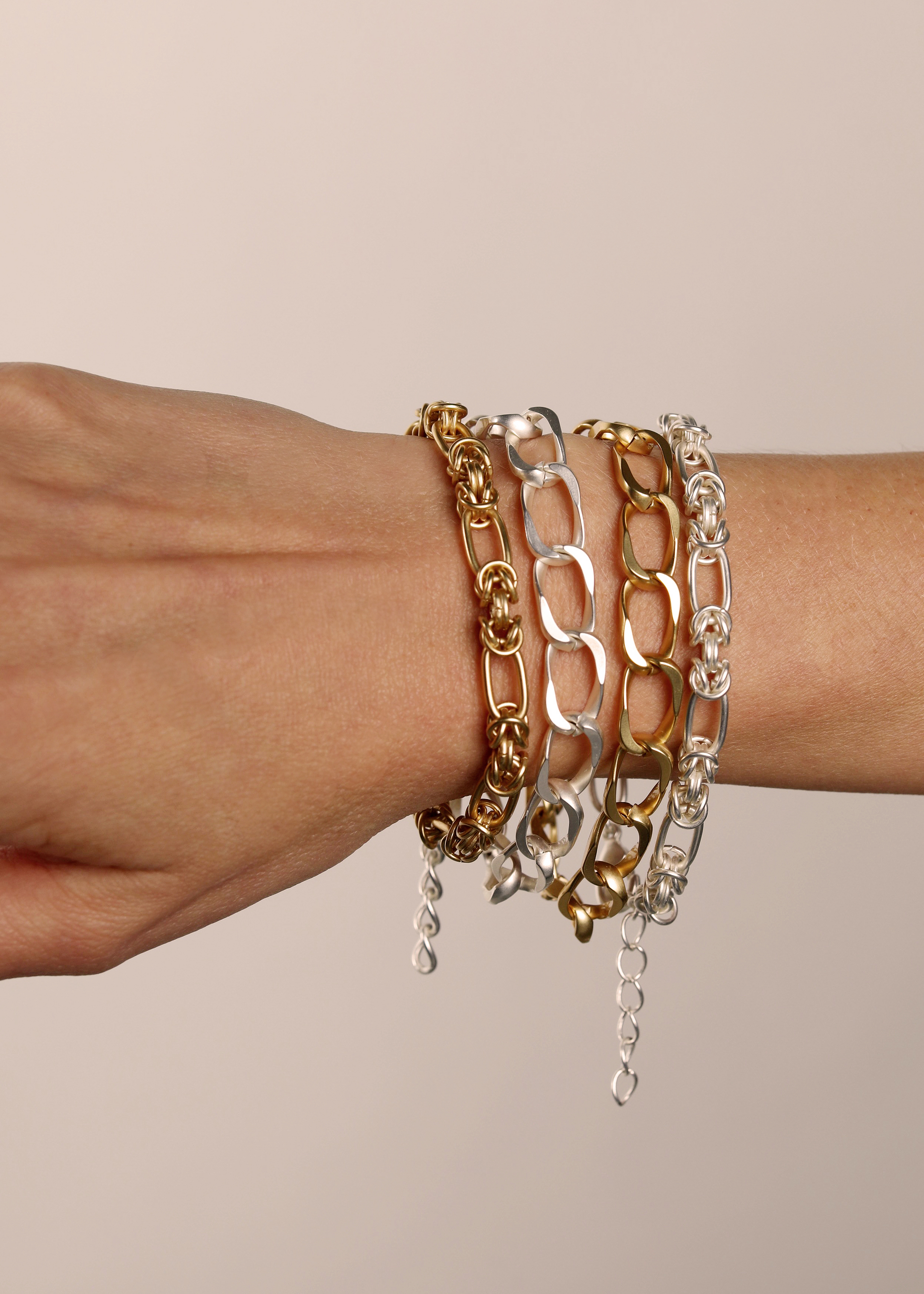 Nowoczesna forma klasycznego stylu bransoletki typu pancerka z dużymi, szerokimi ogniwami w kolorze złota lub srebra.