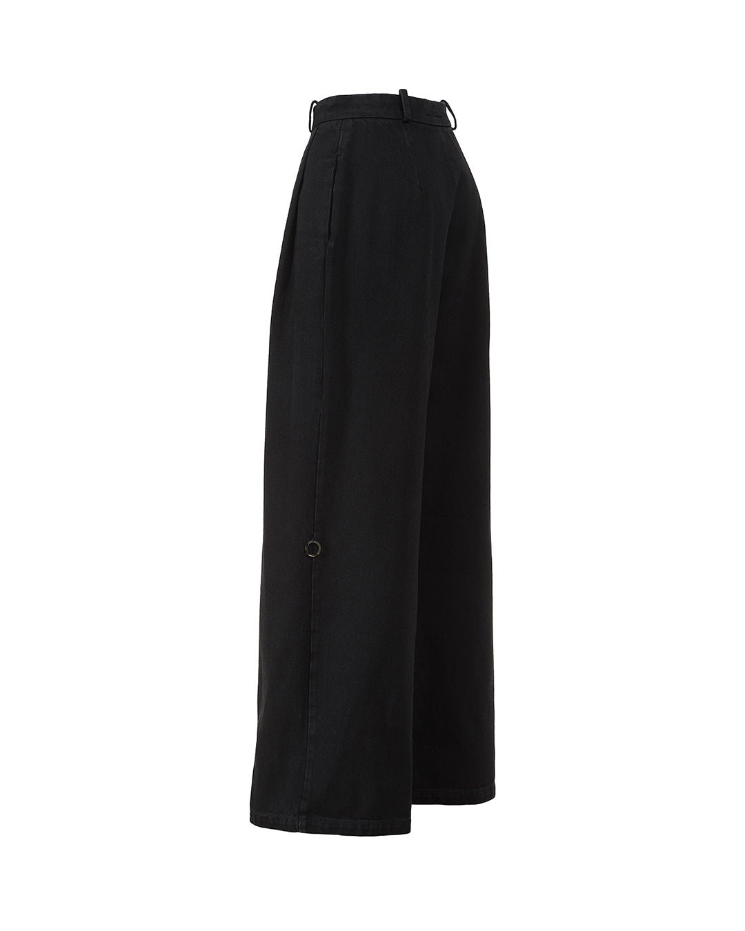 Spodnie z szeroką nogawką i ozdobnymi zakładkami. Zapinany na guzik pasek jest ozdobiony dodatkowym, ręcznie przyszytym zatrzaskiem oraz haftowanym na pasku logo marki.