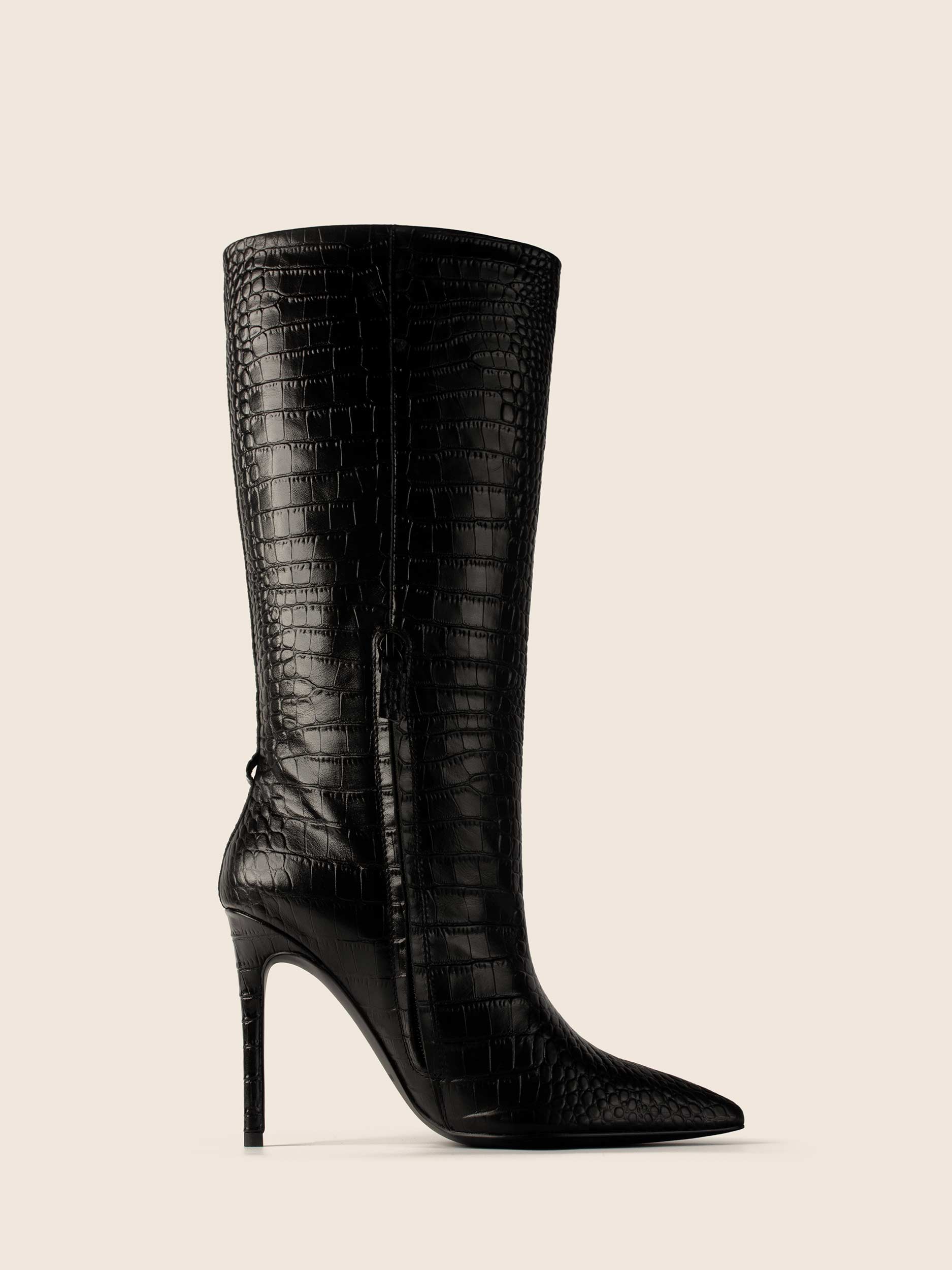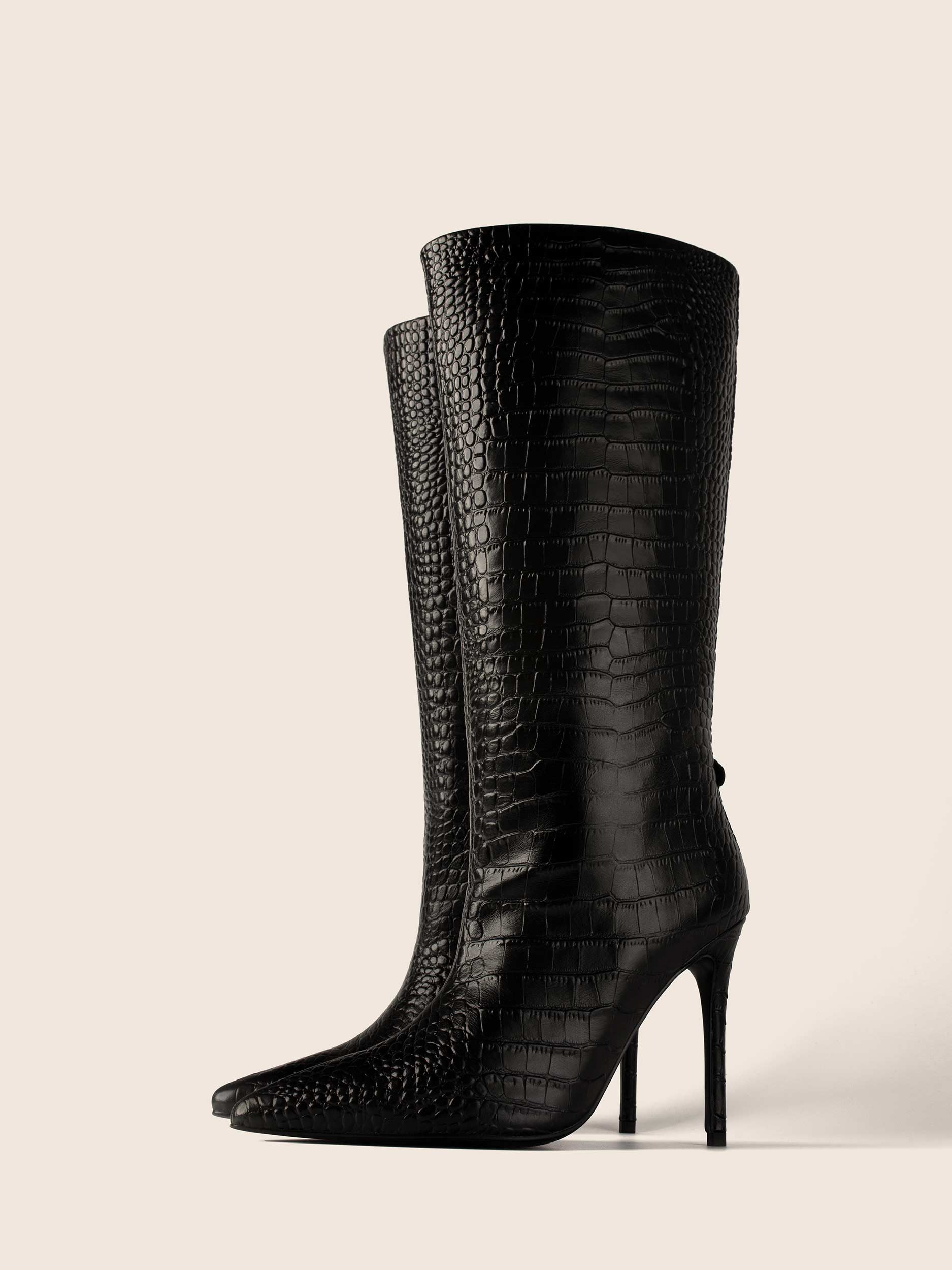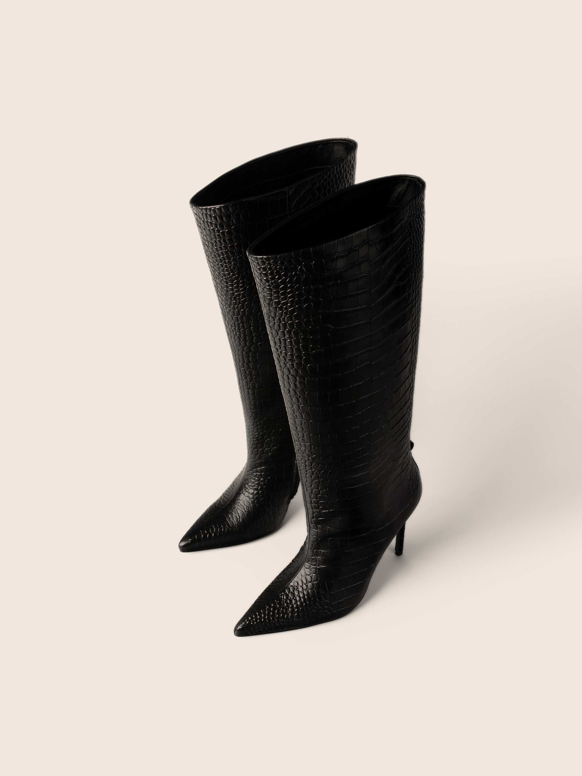 Kozaki IRE wykonane z naturalnej licowej skóry owczej z naturalną skórzaną wyściółką. Kozaki na wysokim obcasie zapinane na suwak.