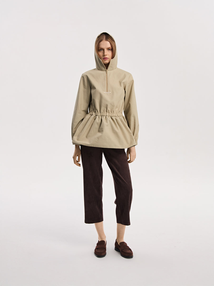 Lekko ocieplana kurtka z kapturem w sportowym stylu, zakładana przez głowę z suwakiem z przodu, podszyta pikowana ociepliną, z gumka w pasie i ściąganymi gumką rękawami