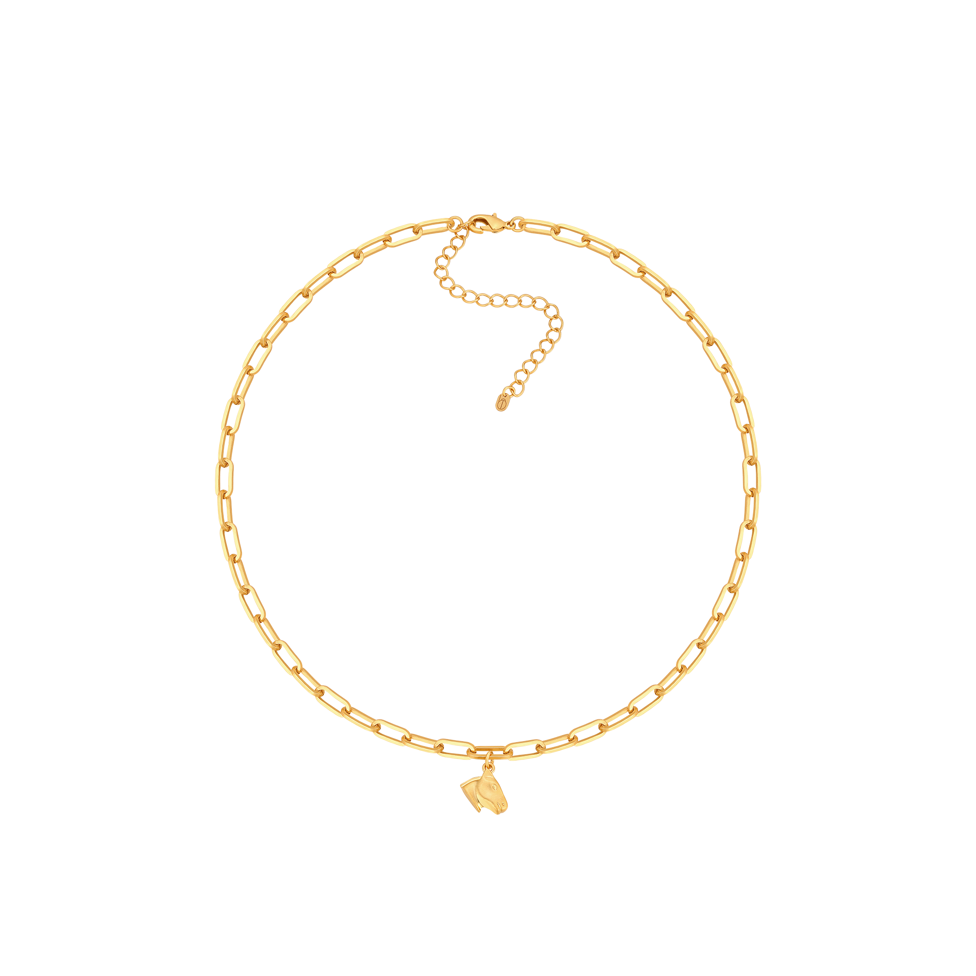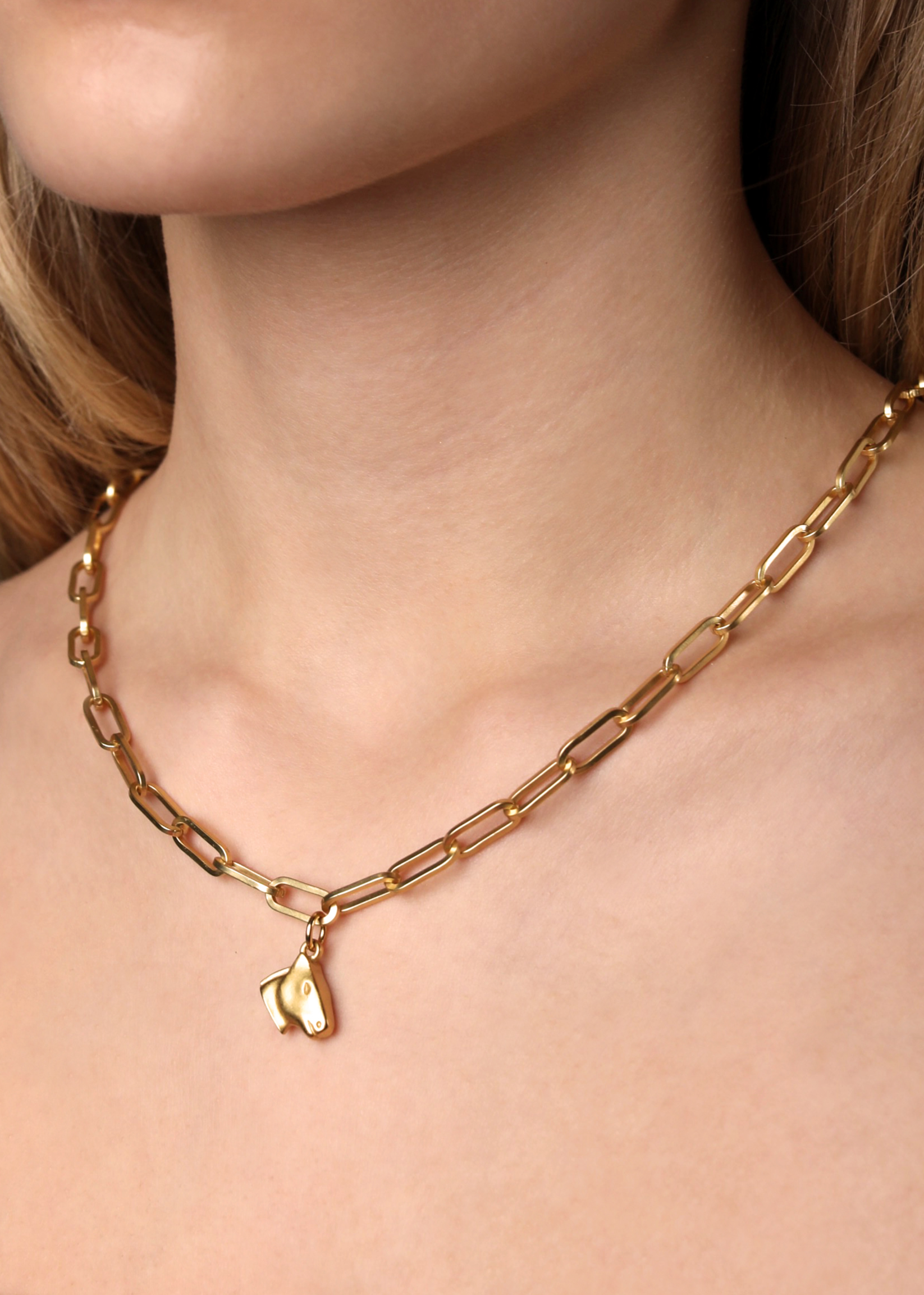 Prostokątny łańcuszek z konikiem w kolorze srebrnym lub złotym. Subtelny konik zawieszony na charakternym prostokątnym łańcuszku, który potęguje symbolikę konia podkreślając jego atrybuty siły, szlachetności i zmysłowego piękna.