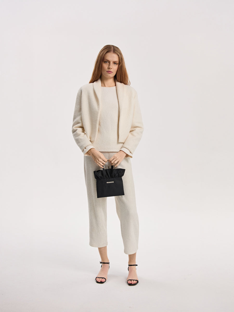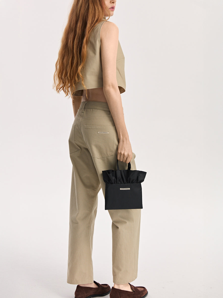 Mała torebeczka do ręki zapinana na suwak, z ozdobną falbaną