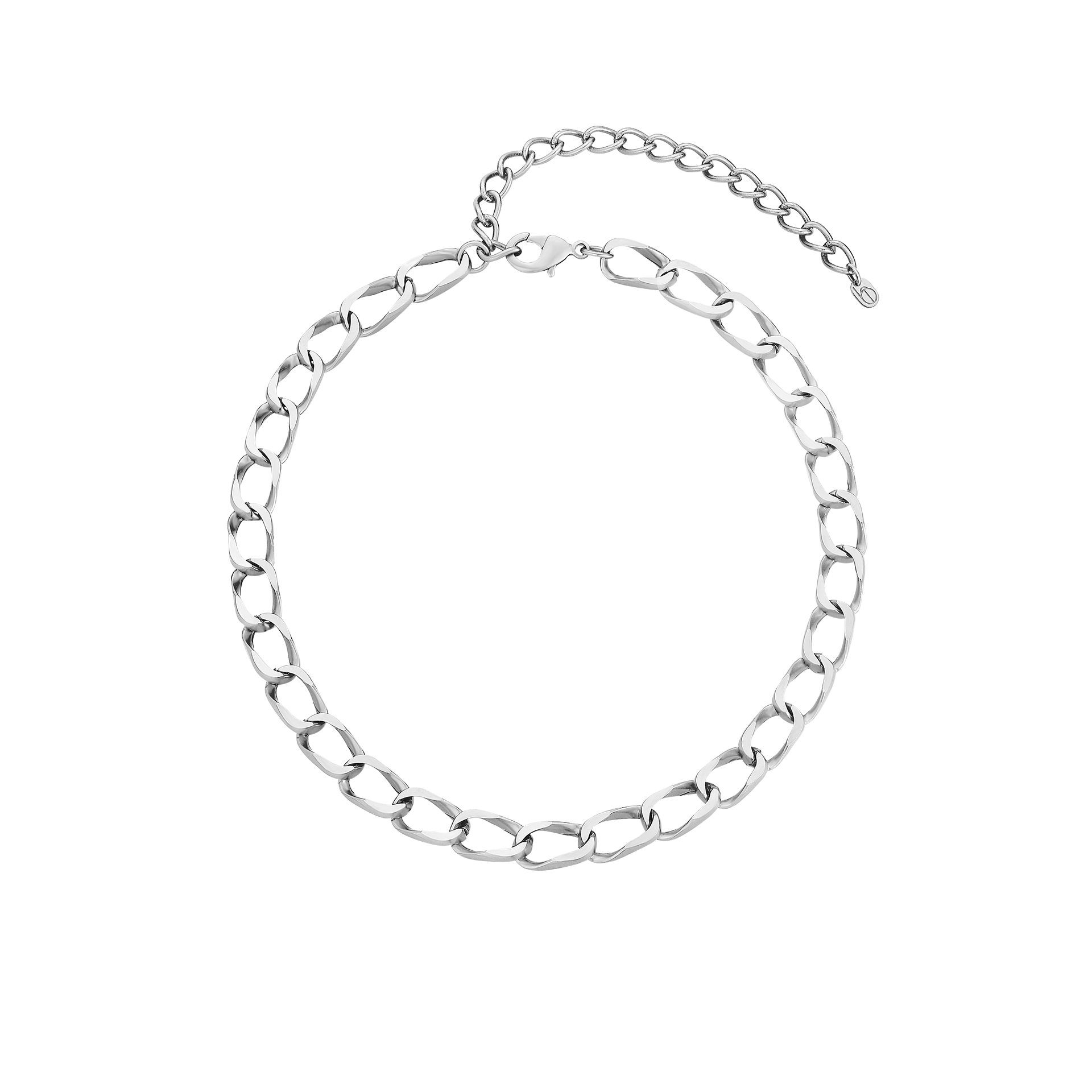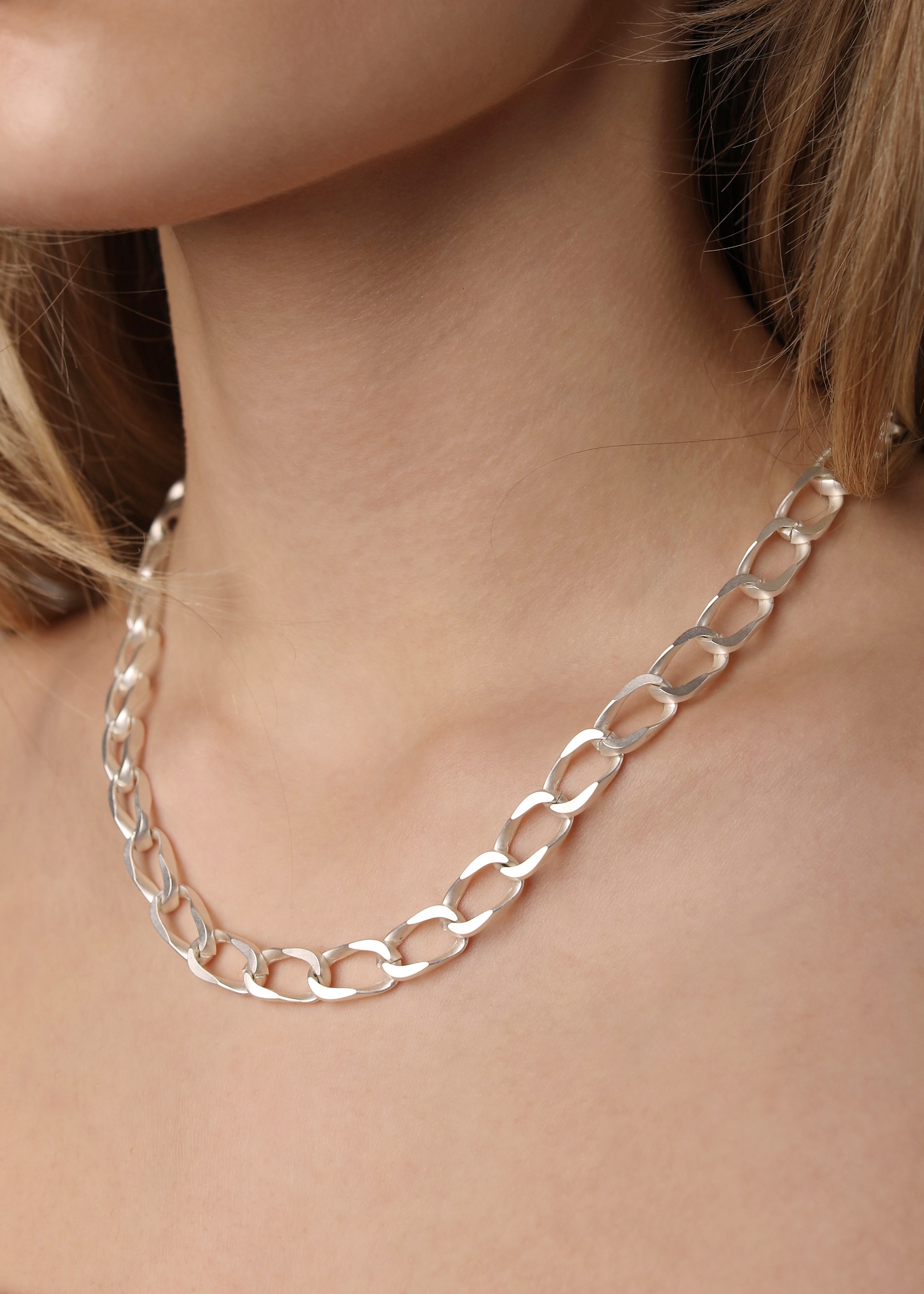 Nowoczesna forma klasycznego stylu splotu typu pancerka z dużymi, szerokimi ogniwami w kolorze srebra.