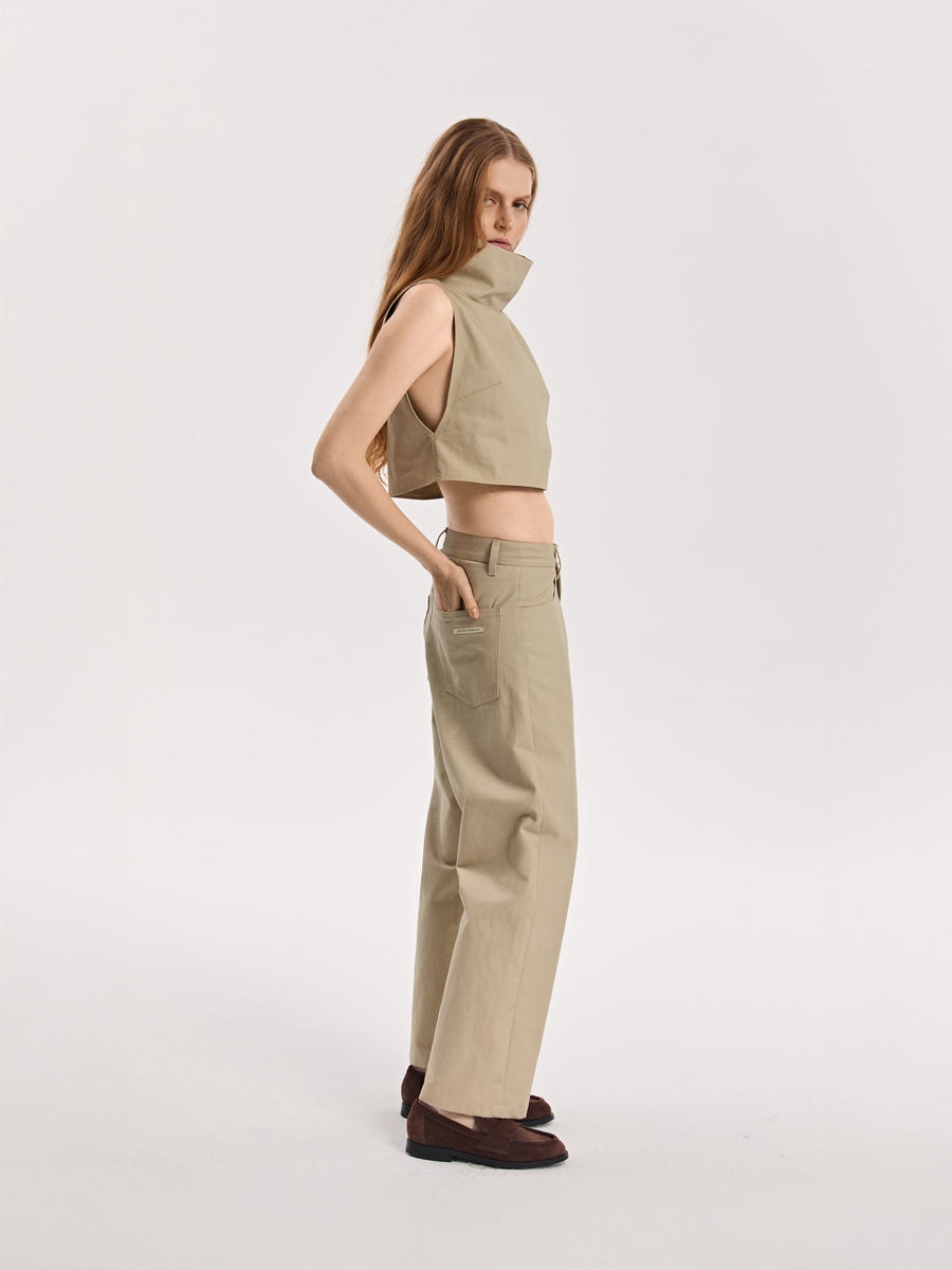 Luźne spodnie biodrówki z obniżonym krokiem, z kieszeniami, suwakiem, z bawełnianej płóciennej tkaniny